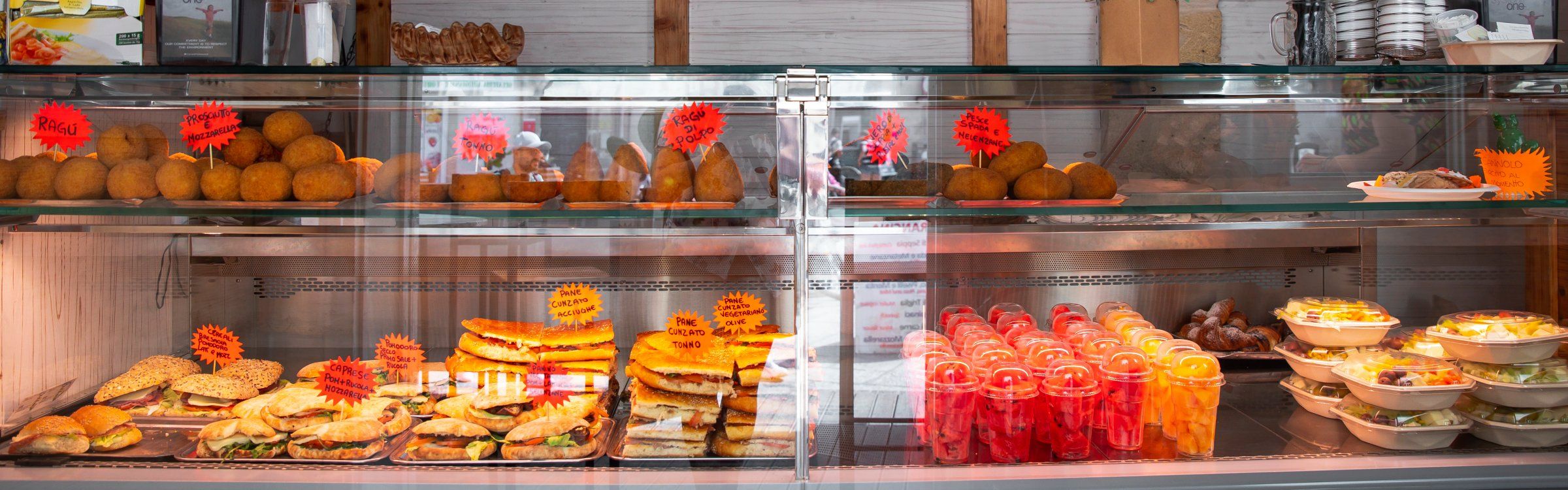 Se ami lo street food siciliano, una vasta selezione di arancine non mancherà al nostro bancone. E ancora il tipico pane cunzato, le panelle con farina di ceci, le insalatone e i taglieri da aperitivo di pesce e di carne.